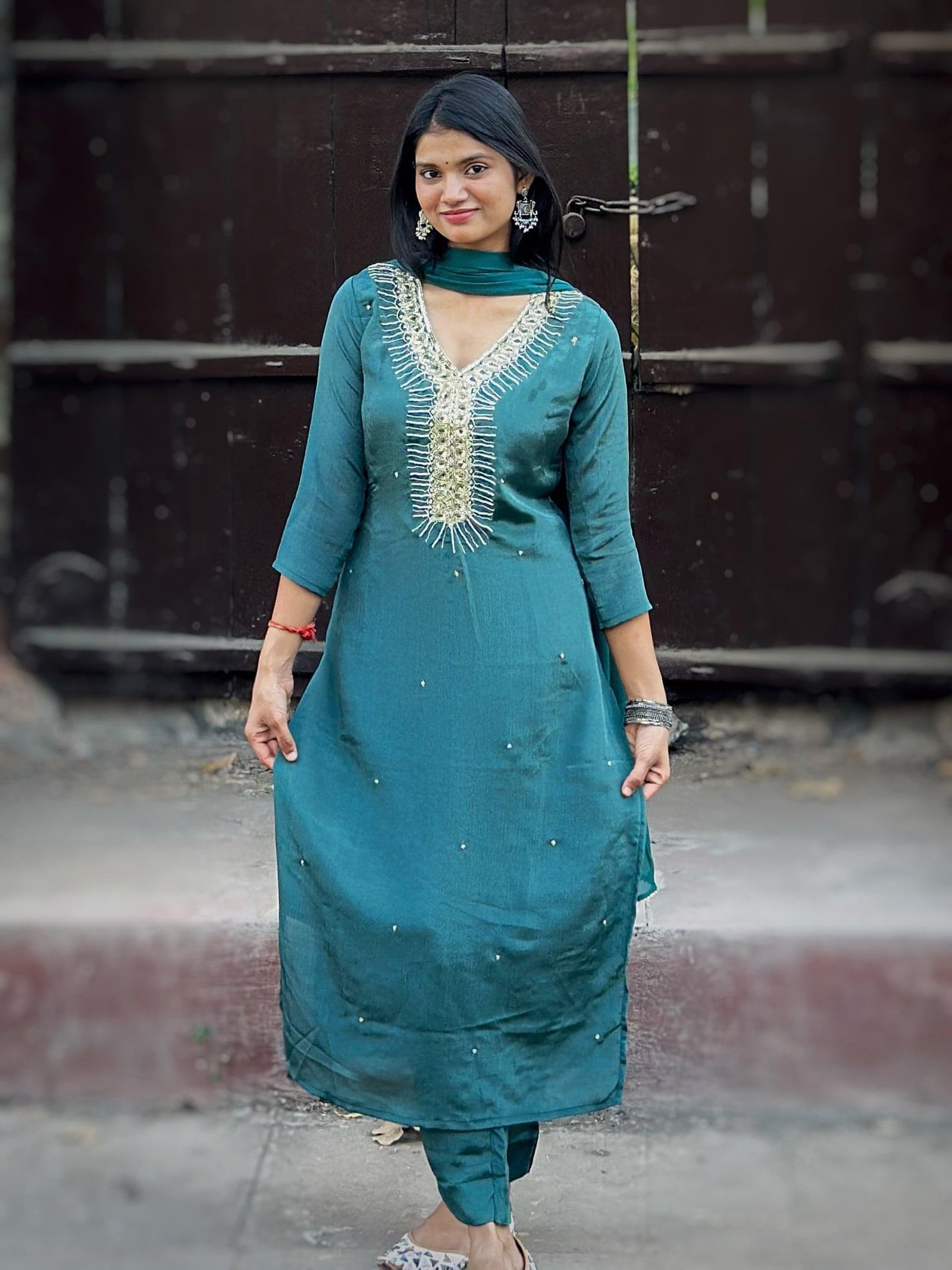 Teal Blue V-Neck Embroidered Floral Straight Suit Set