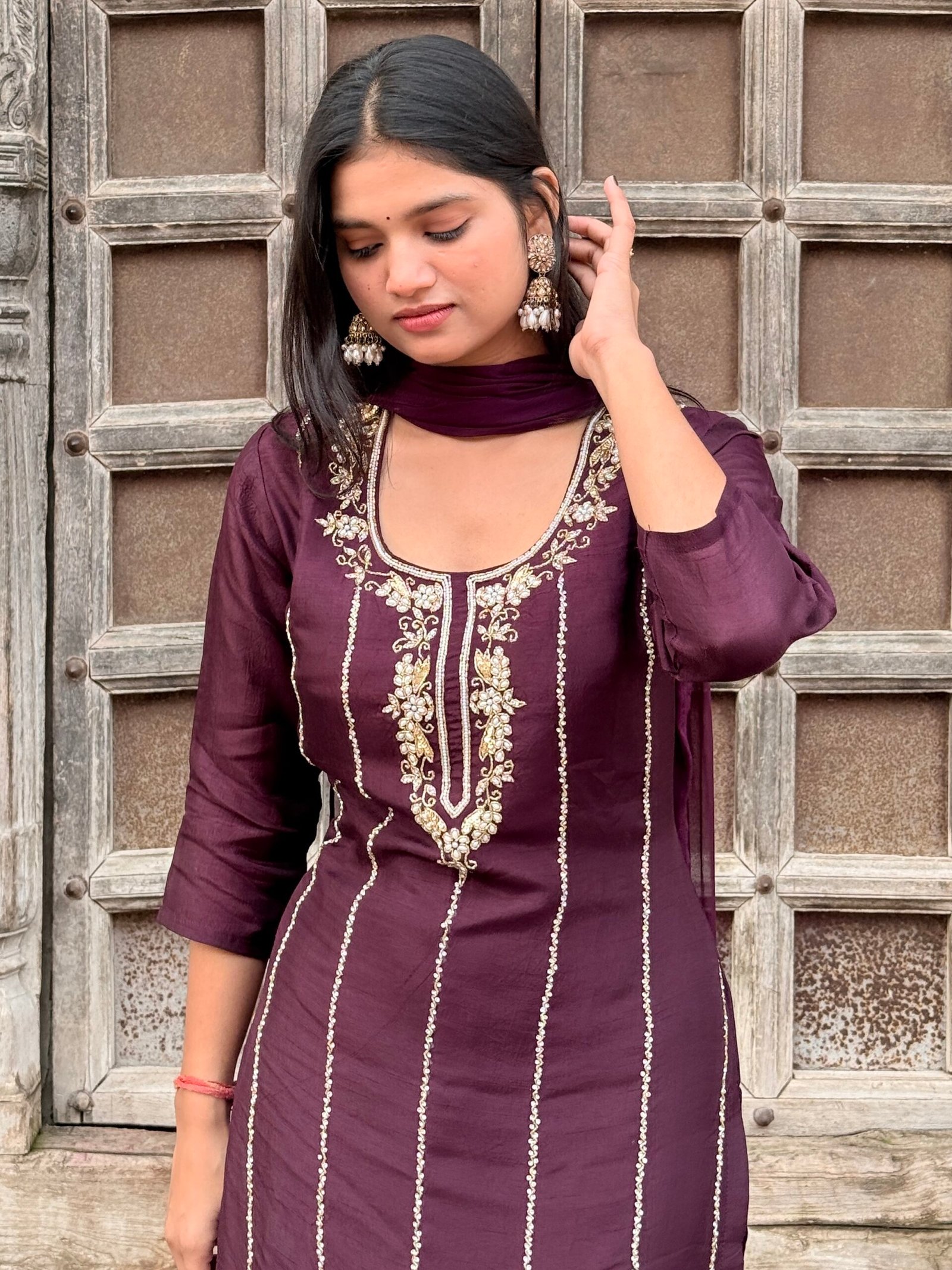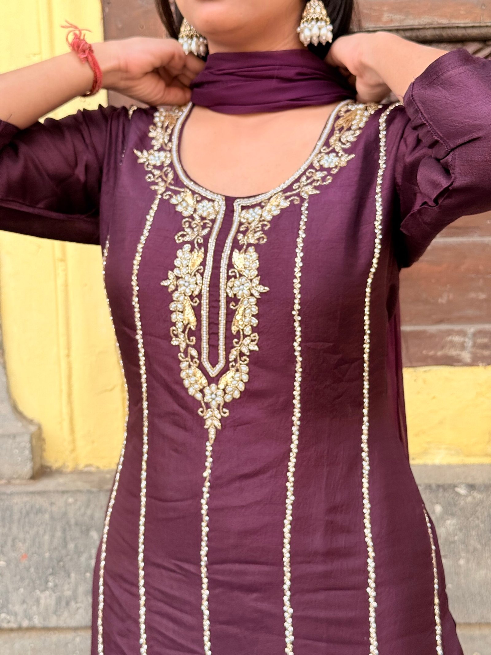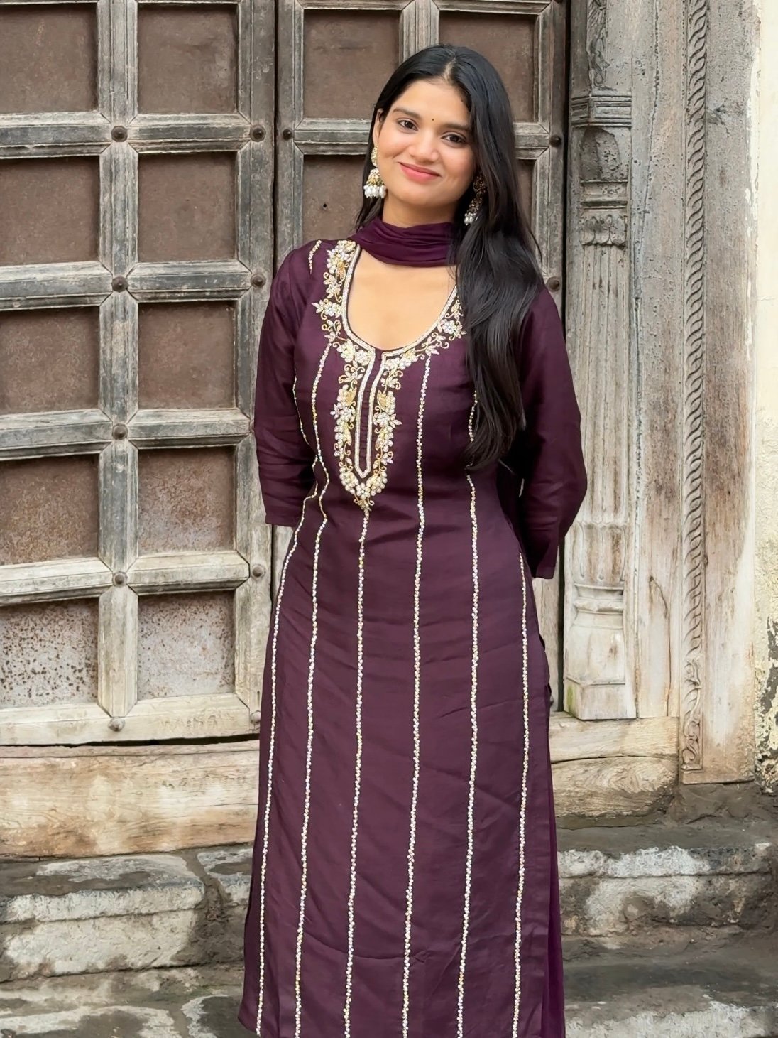 The luxurious sheen of Dola silk combined with fine craftsmanship makes this suit set perfect for weddings, festive gatherings, and elegant day functions.