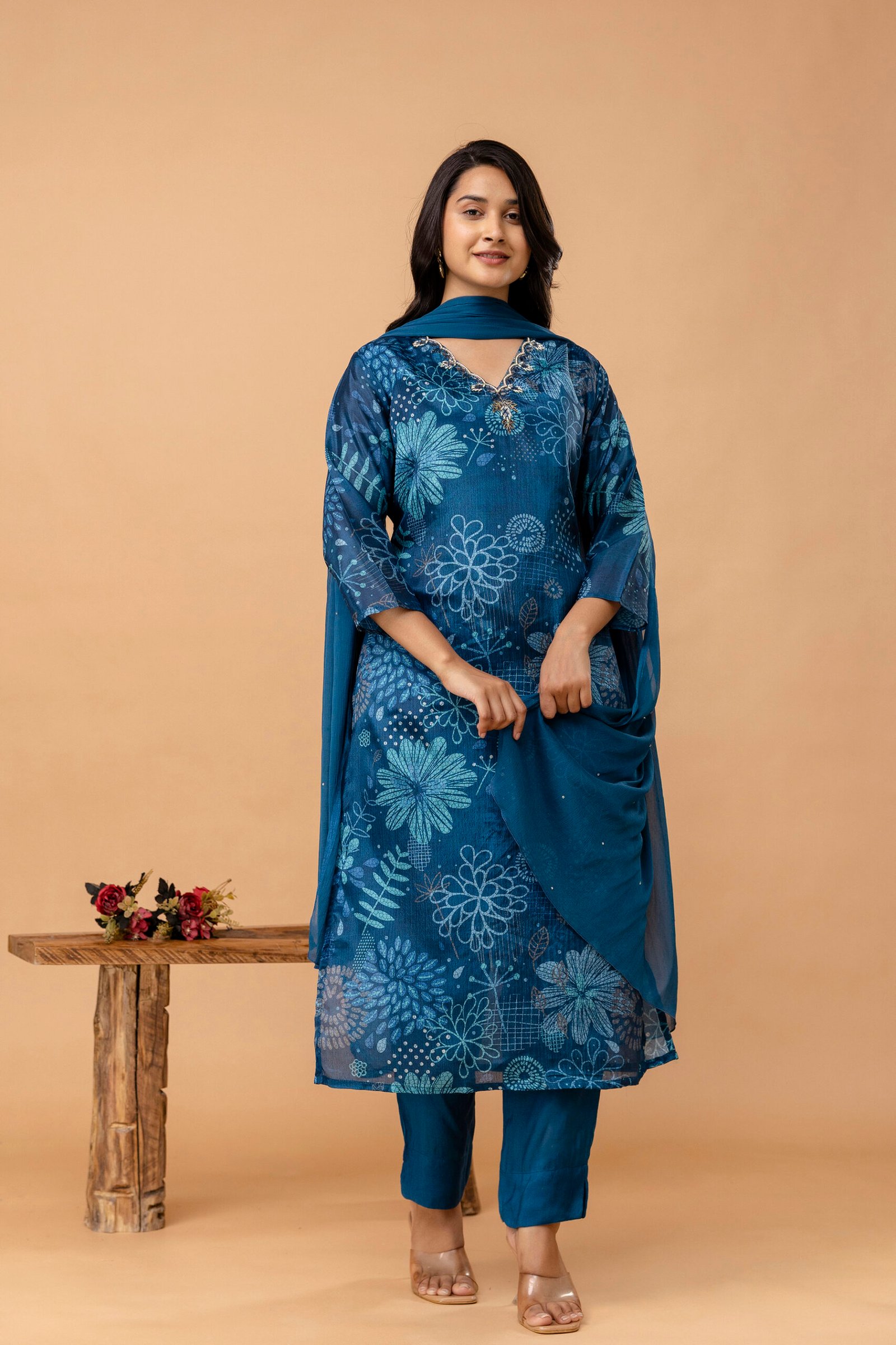 Be the first to review “Blue V-Neck Embroidered Straight Suit Set” Cancel reply