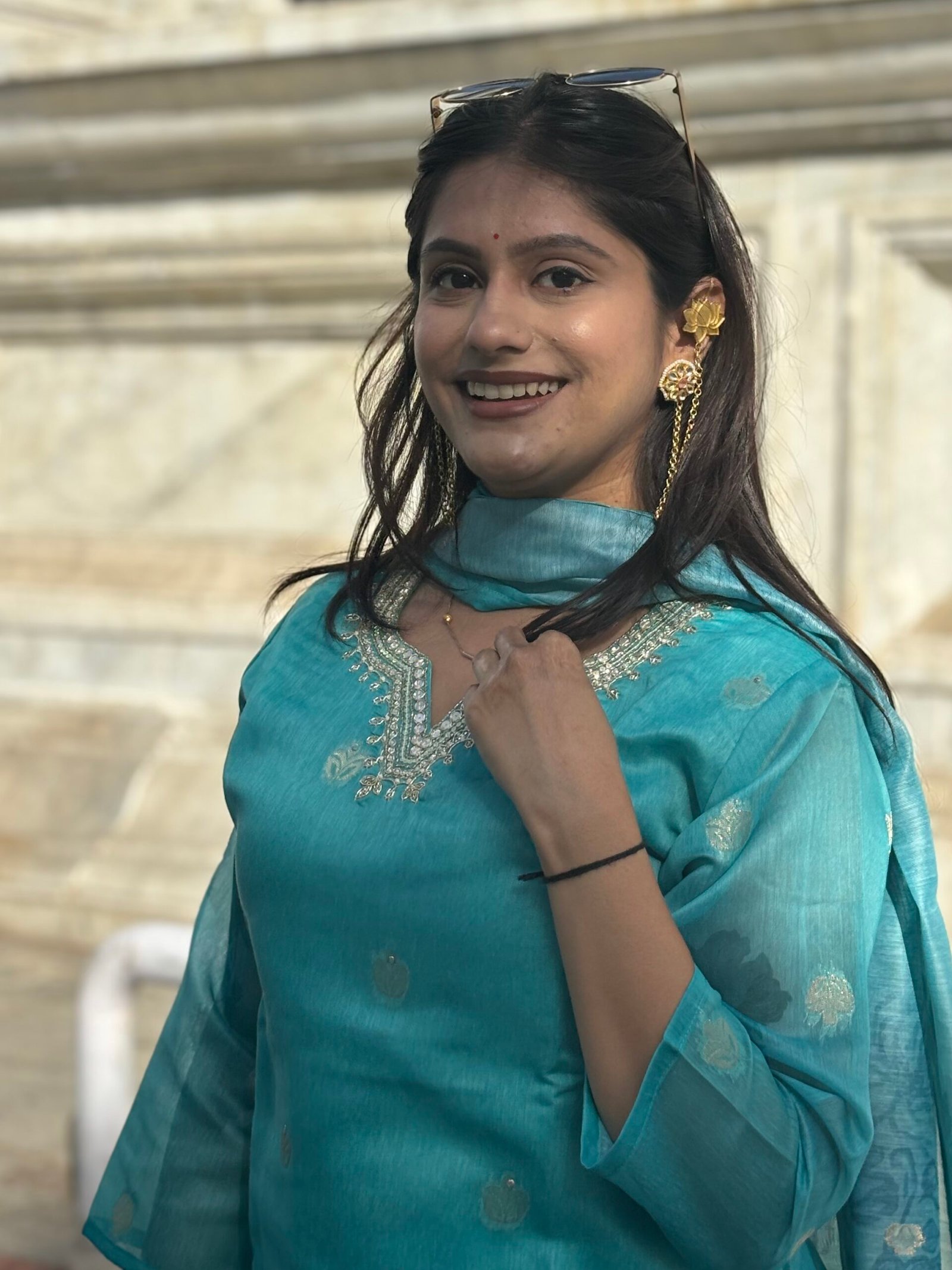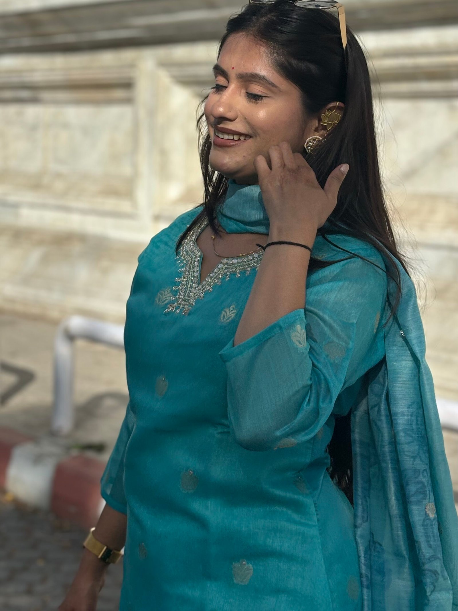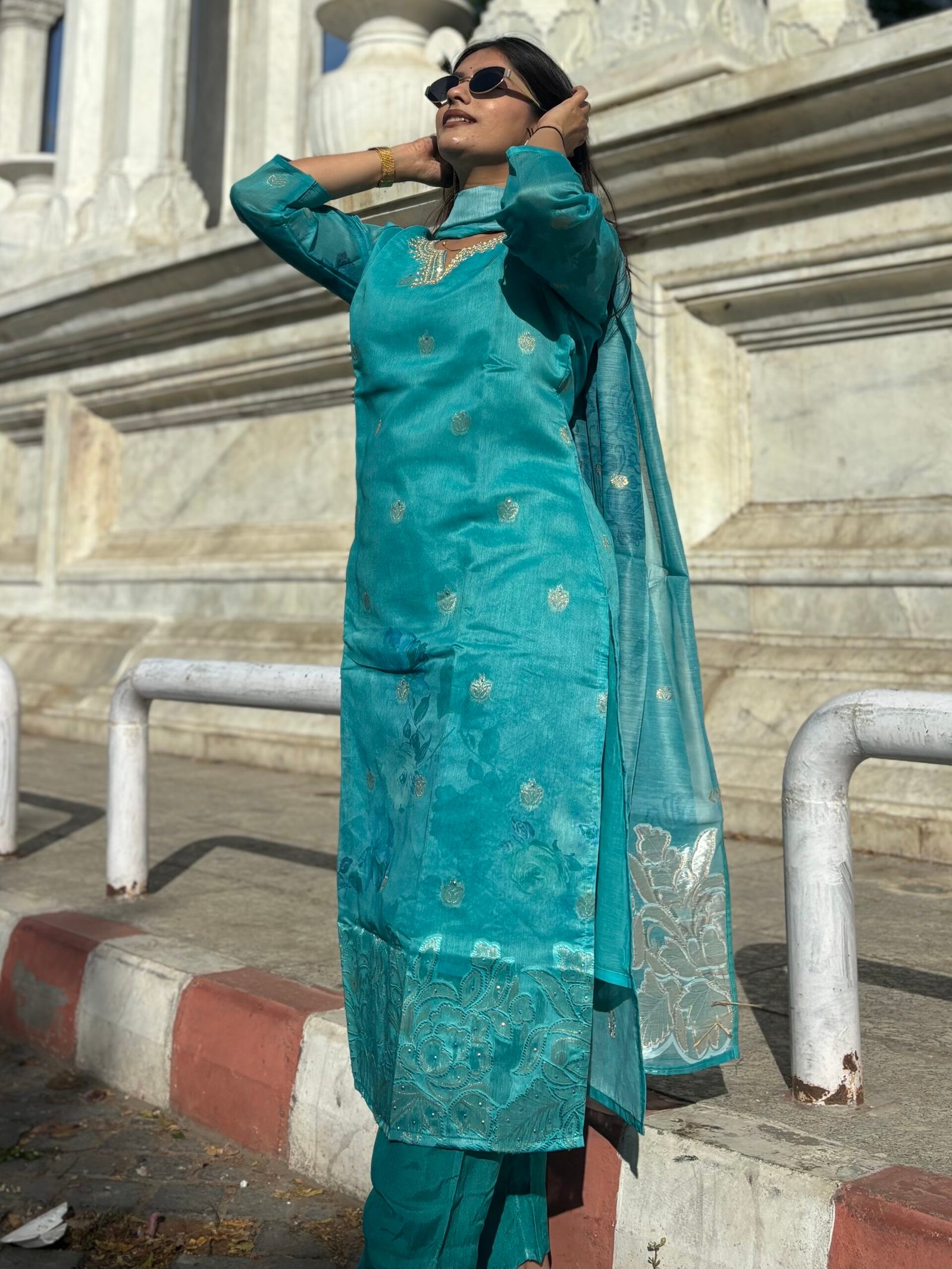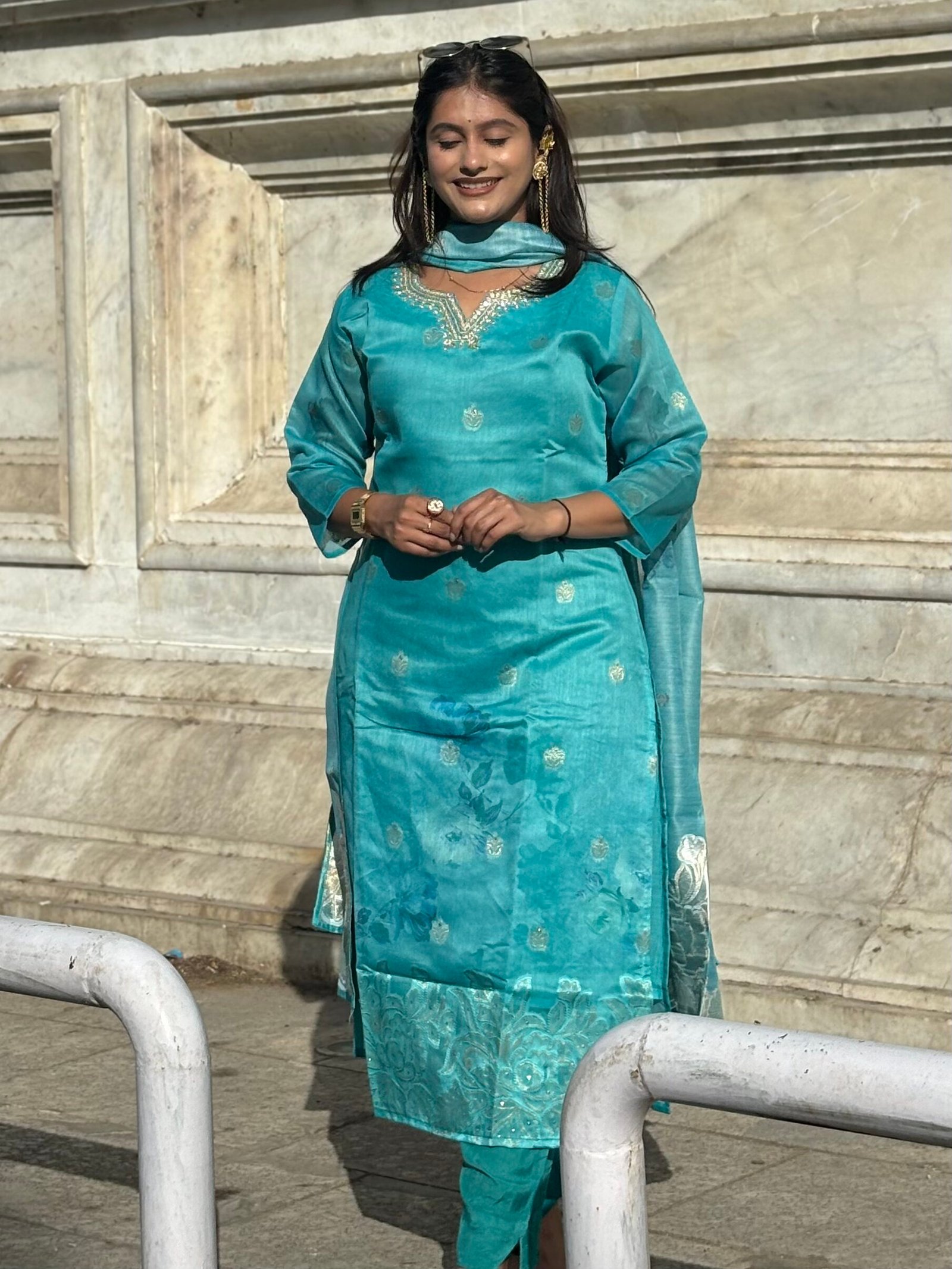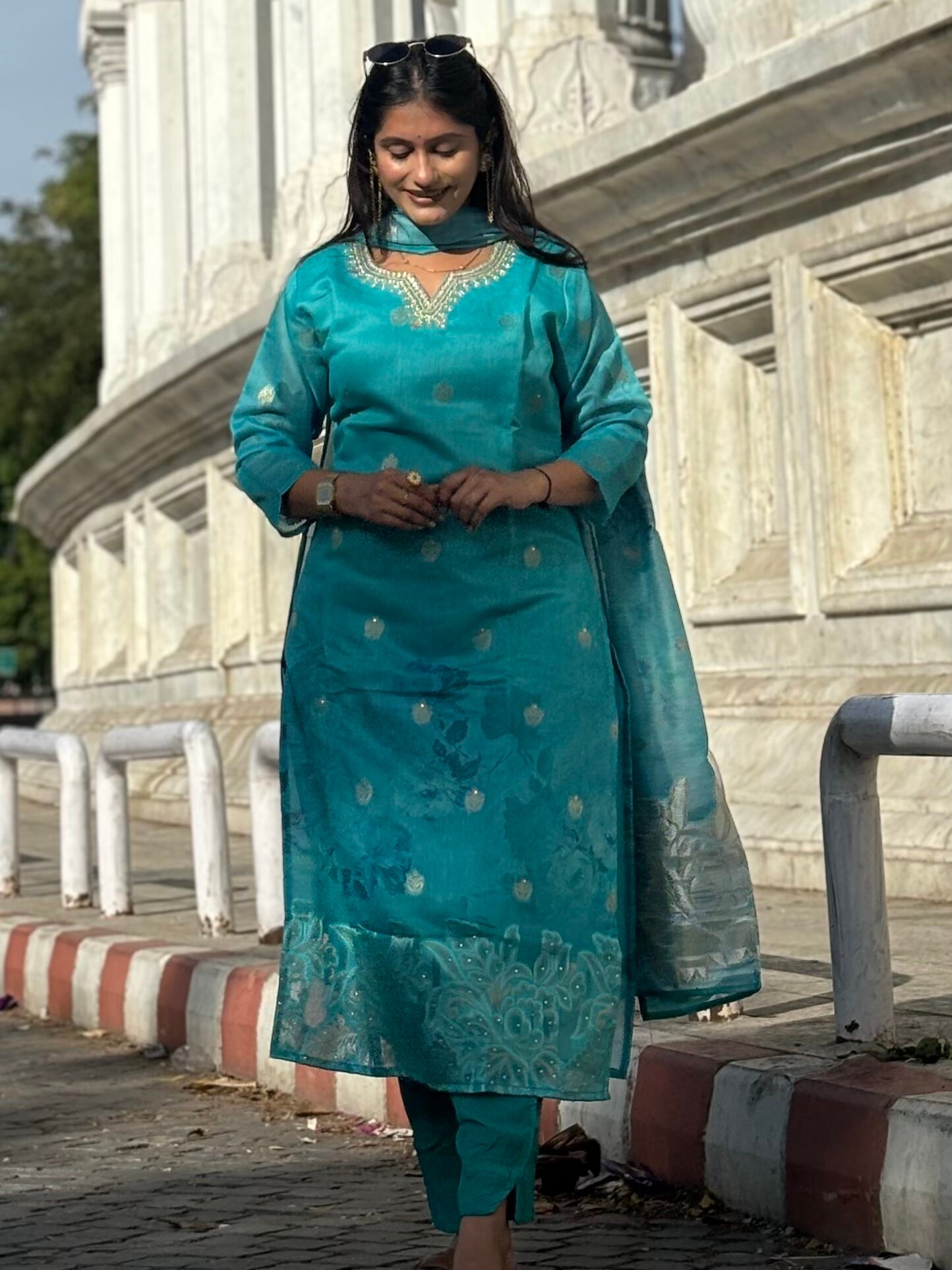 Teal Blue V-Neck Embroidered Floral Straight Suit Set