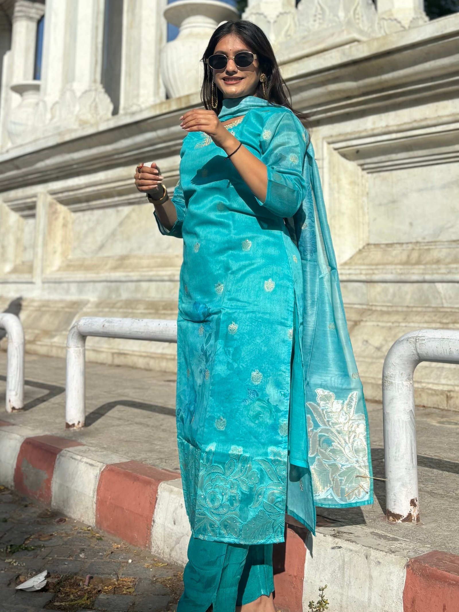 Aqua Embrace Embroidered Straight Suit Set
