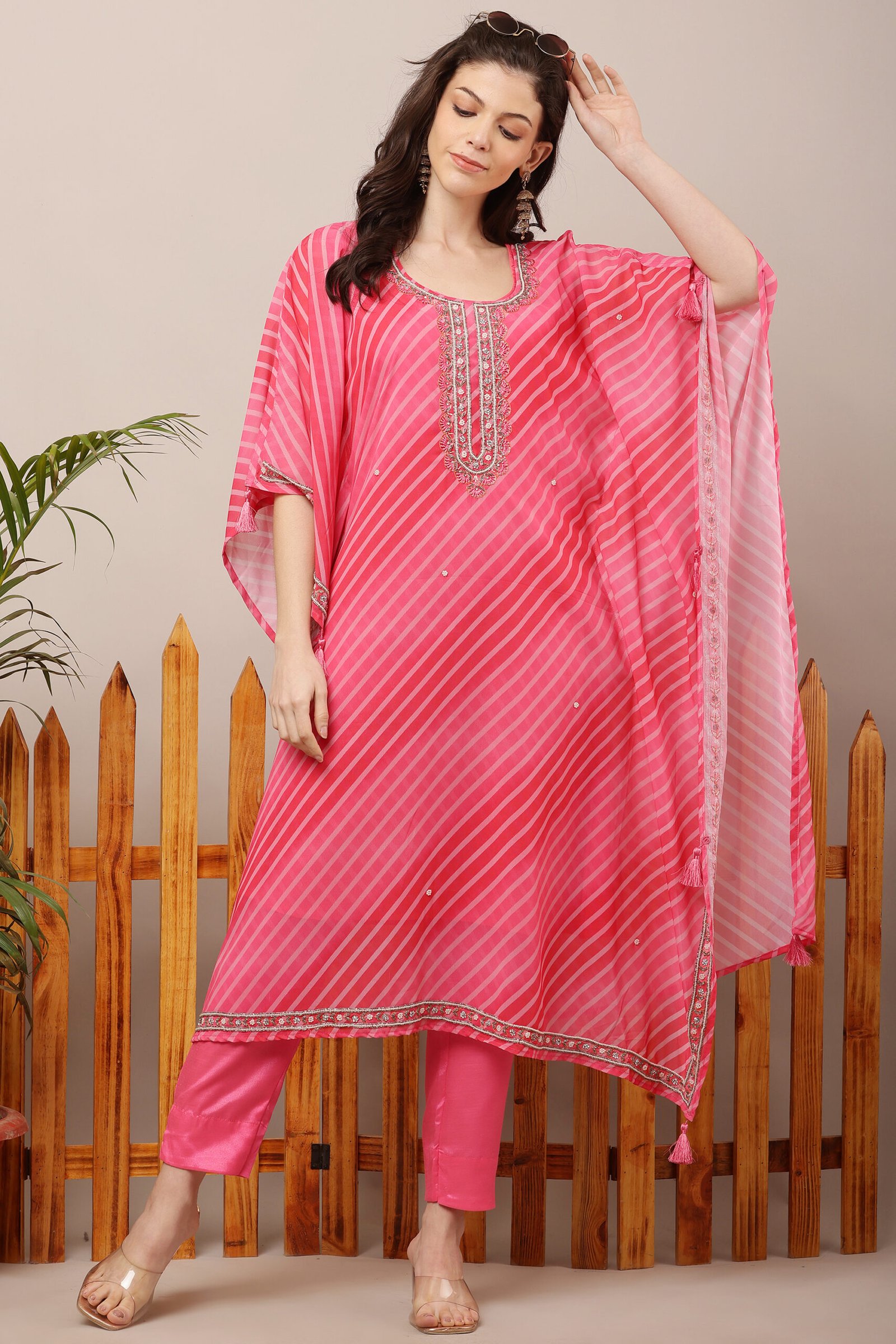 Embrace effortless elegance with our Pink Leheria Kaftan Suit Set, featuring intricate embroidery on the neckline. Crafted from soft, breathable fabric, this flowy silhouette offers both comfort and style, making it perfect for any occasionābe it festive celebrations, casual gatherings, or evening soirees. Elevate your ethnic wardrobe with this timeless fusion of tradition and modern charm!