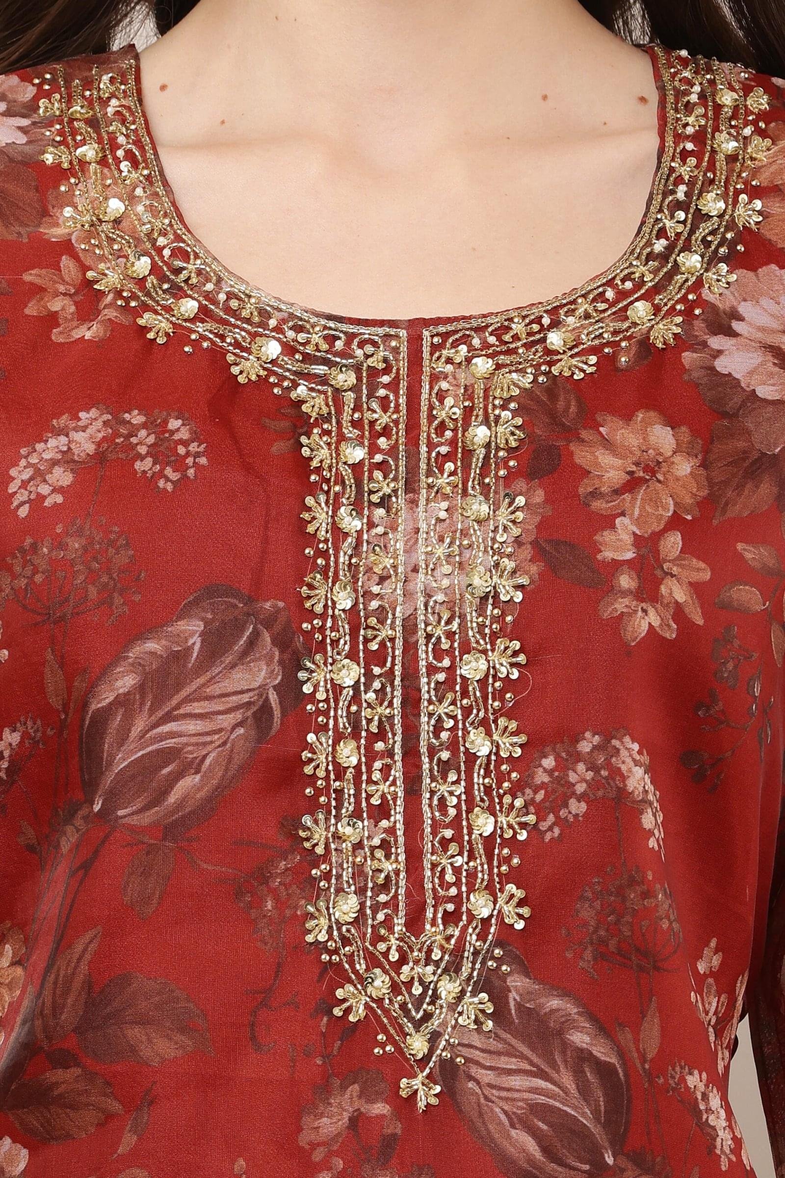 Red Floral Organza Straight Suit Set