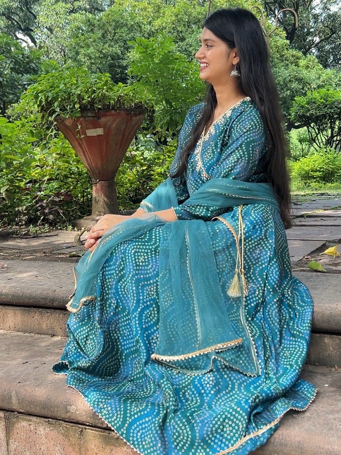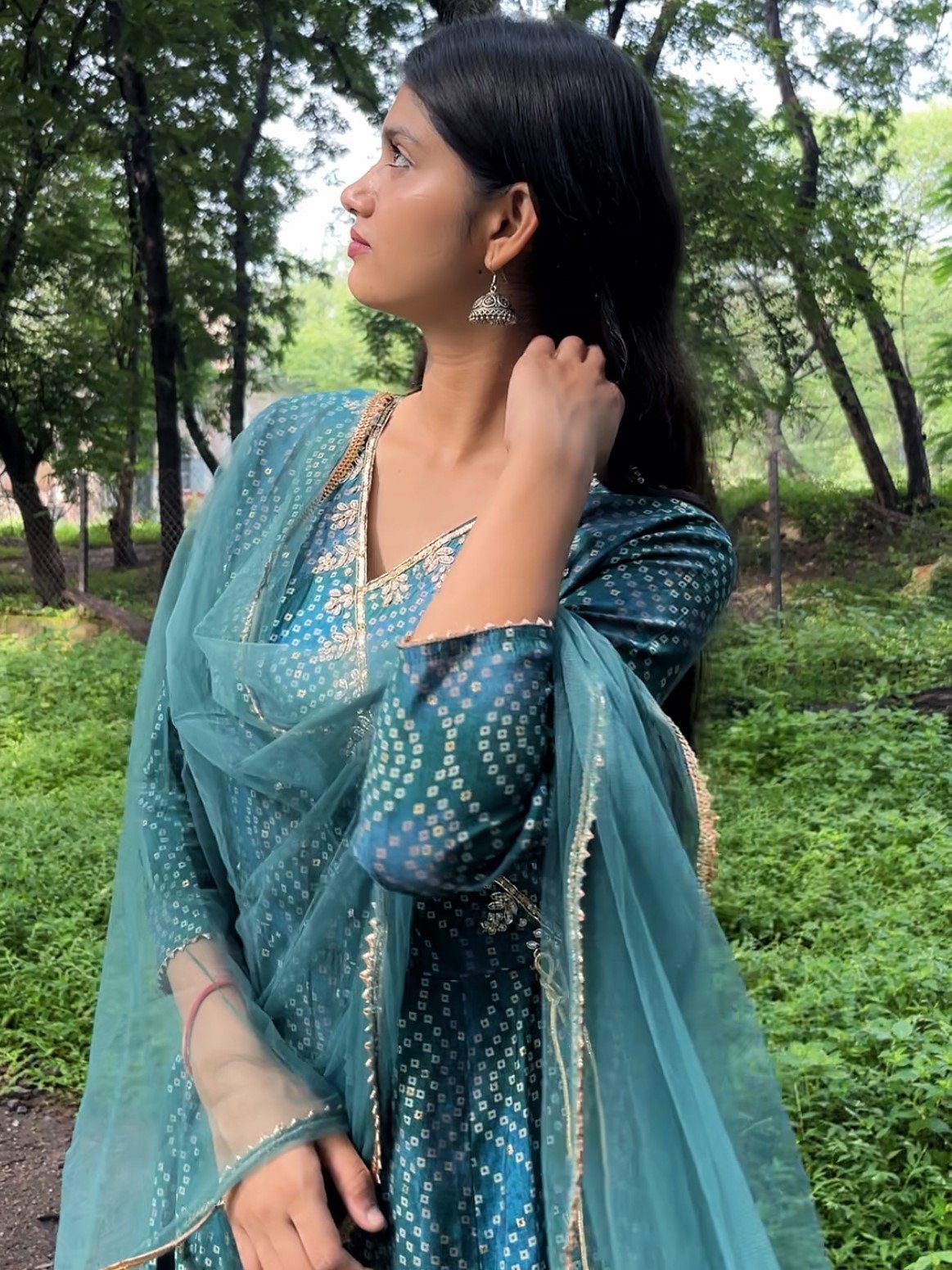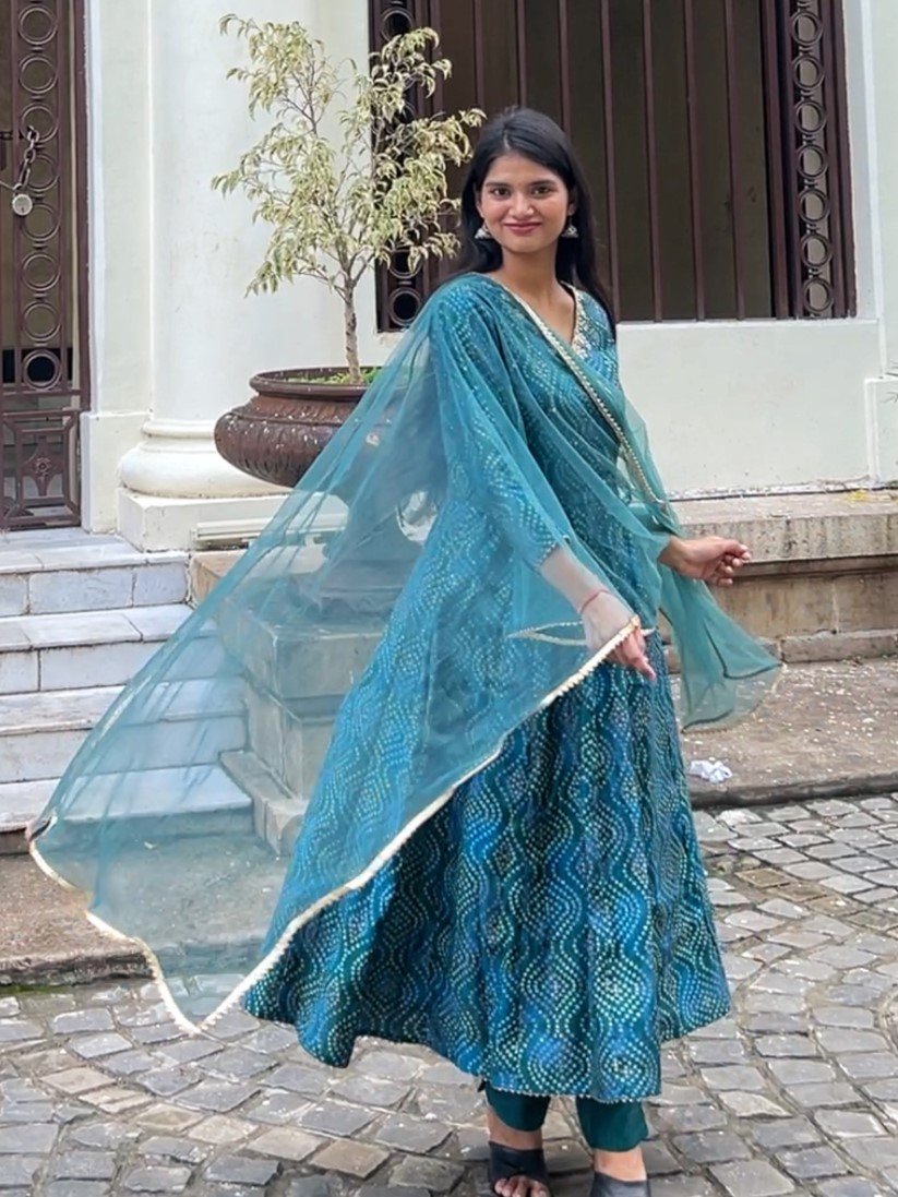 Sea green Bandhej Anarkali Suit Set