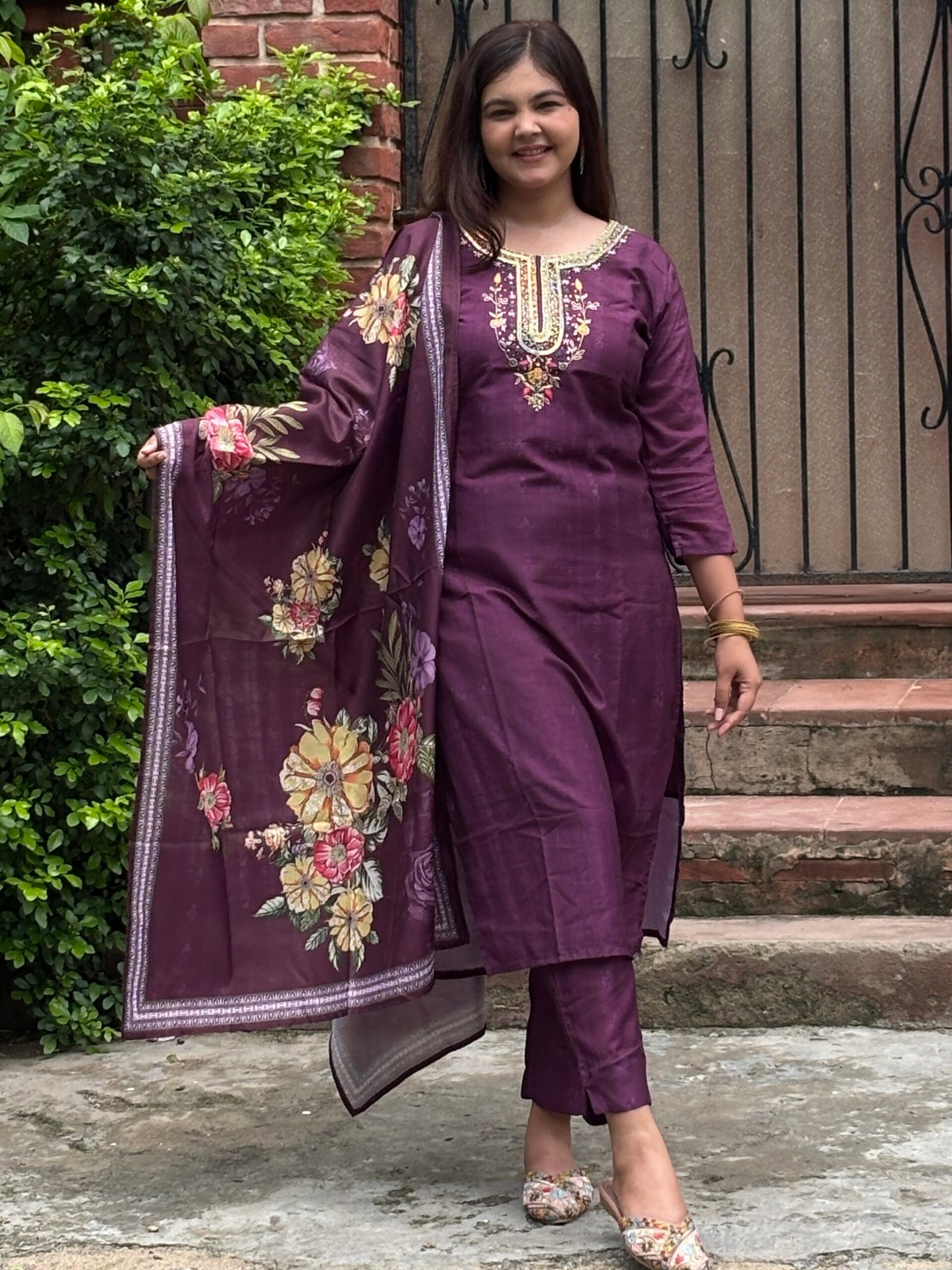 Wine Royale Muslin Silk Embroidered Straight Suit
